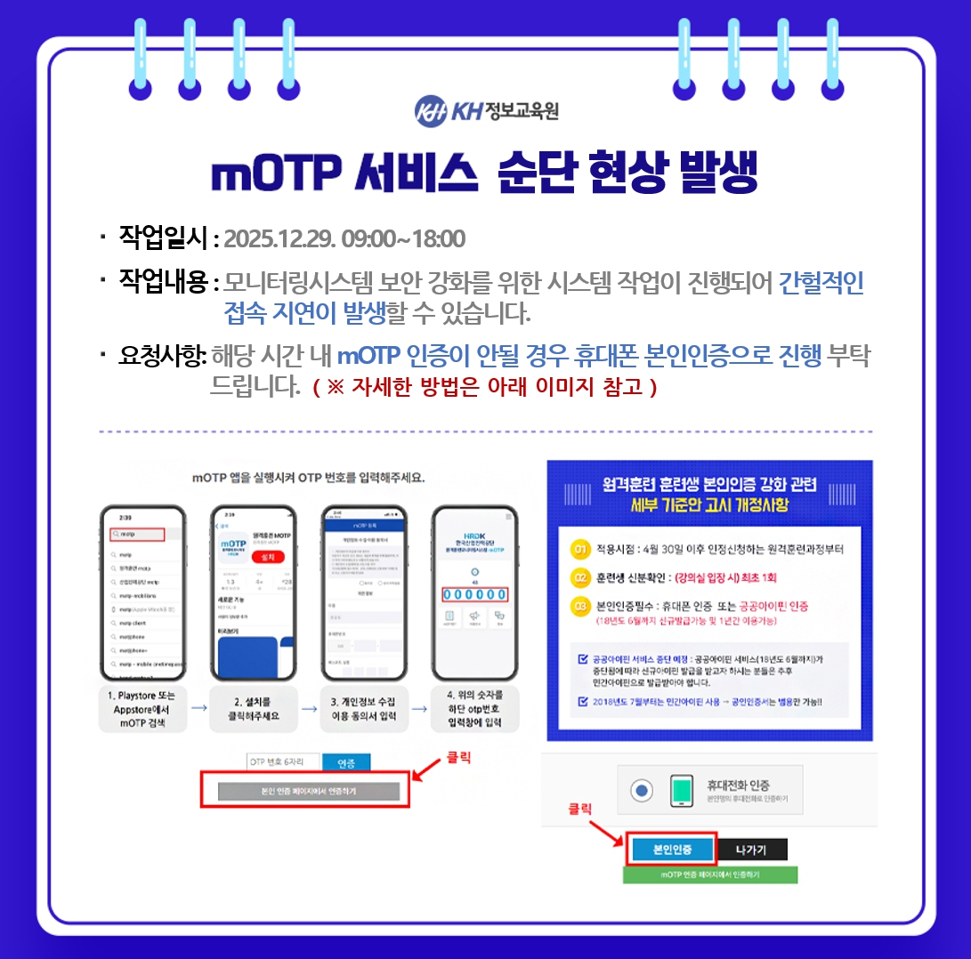안녕하세요 2023년 01월 18일 오전 9시부터 점검예정이였던 서버점검이 부득이하게 2023년 01월 19일로 연기 되었습니다 서버점검 동안에는 간혈적 순단현상이 발생될 수 있음을 안내드립니다